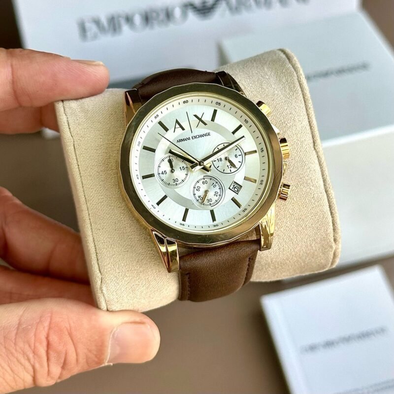 This stylish Armani Exchange chronograph watch combines functionality with an eye-catching design. The soft brown leather strap not only provides comfort but also enhances the overall aesthetic, making it a versatile choice for both casual and formal occasions.