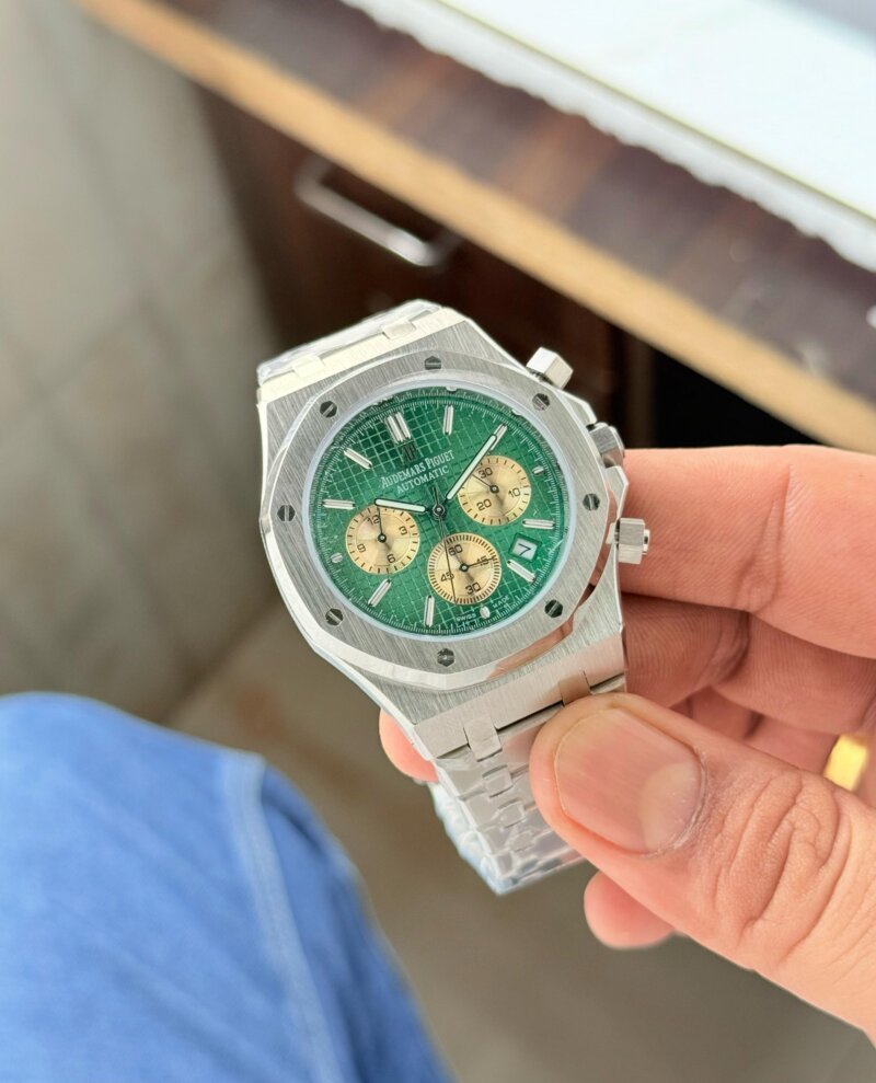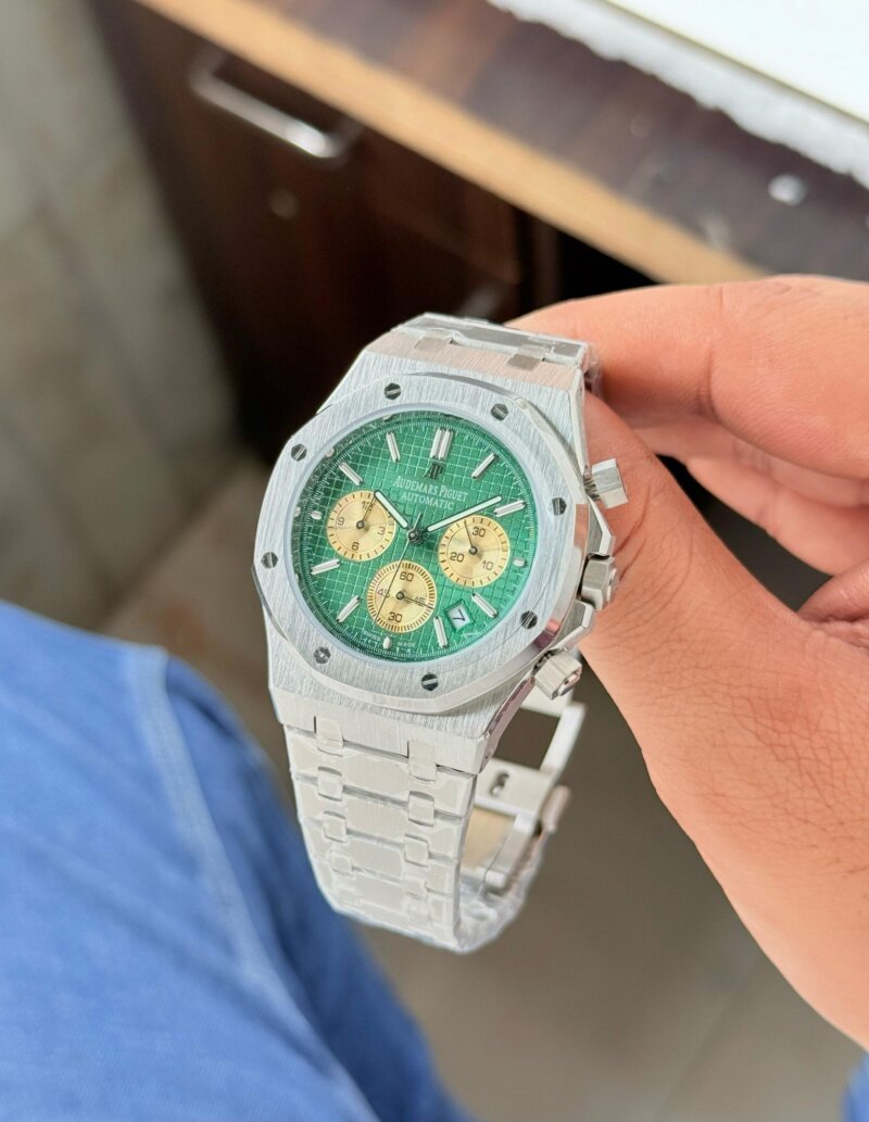 The Audemars Piguet Royal Oak Chronograph Green Dial from the 7AA Premium Collection is a stunning timepiece that effortlessly combines style and functionality. As a watch enthusiast, I can appreciate the meticulous design and craftsmanship that goes into creating such a remarkable watch.