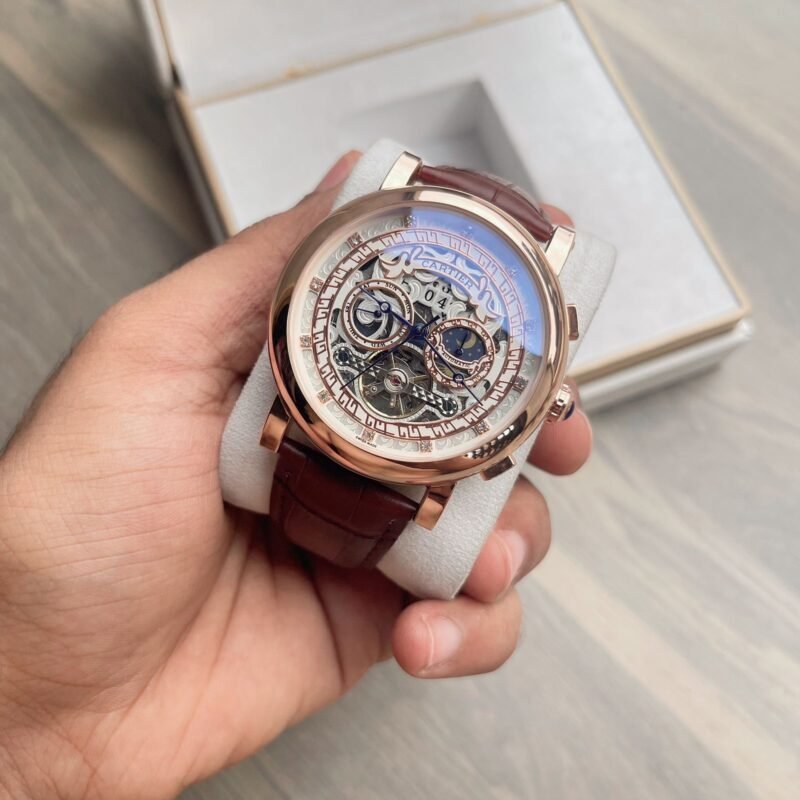 The Cartier SunMoon Rotating Tourbillon is not just a timepiece; it’s a statement of style and sophistication. Its rugged design and meticulous craftsmanship make it an ideal companion for any occasion, be it a casual outing or a formal event. The combination of the stunning rosegold case and the elegant brown leather strap creates a harmonious look that is hard to resist.