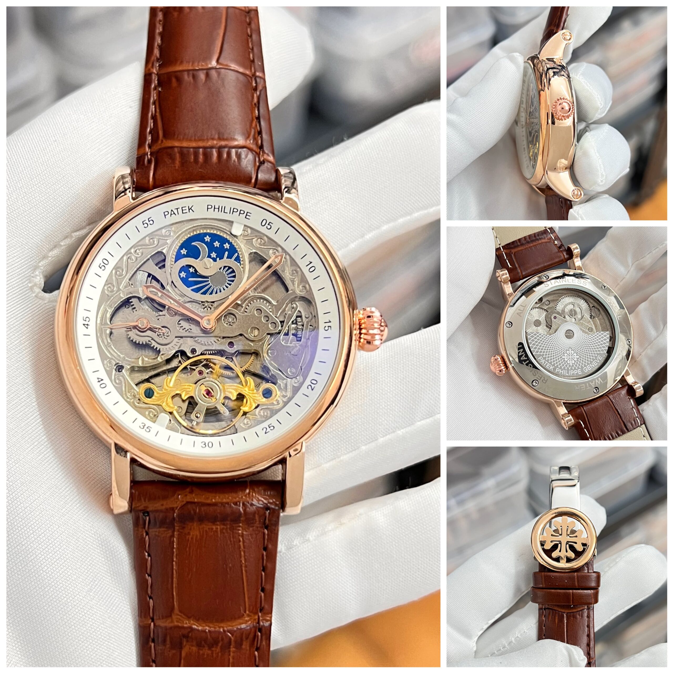 • Key Features: 12-Hour Working, Automatic Analog Clock, Dual Time Zone, Rotating Tourbillon Movement, Sun & Moon Display for Day/Night indication, Brown Leather Strap, Easy Clasp Lock with Logo, Silver Open Machinery White Dial, Rotating Spring Charge, Japanese Pendulum Charge Automatic Movement