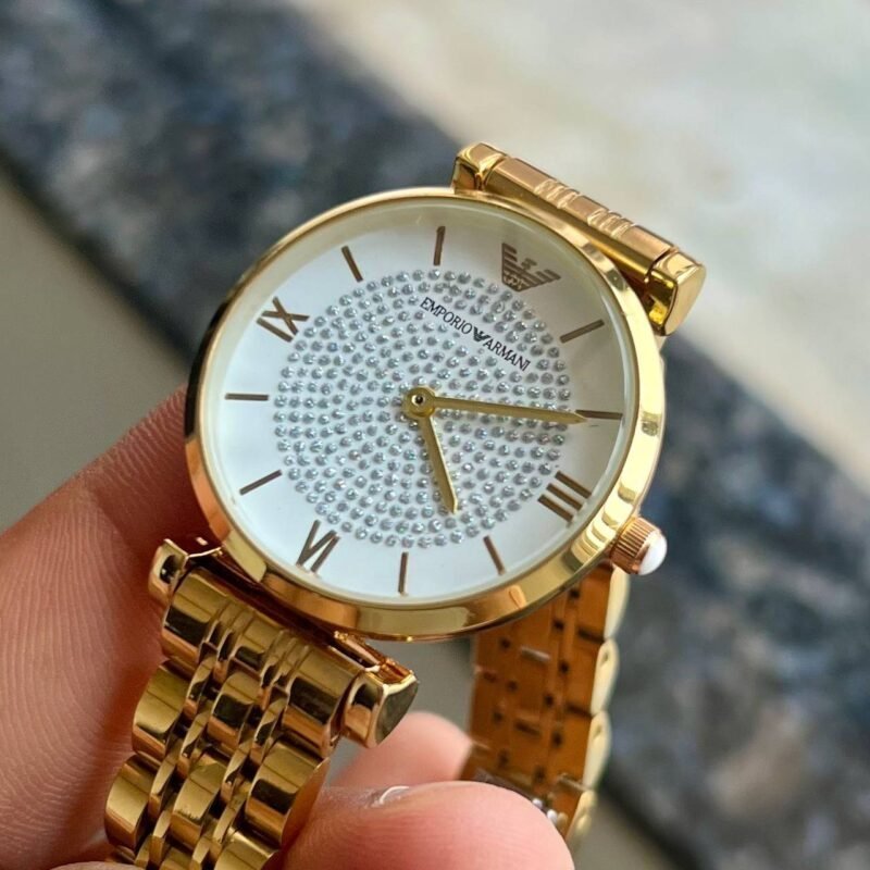 This Emporio Armani watch blends style and elegance with a diamond-studded face and gold finish. Perfect for any occasion!