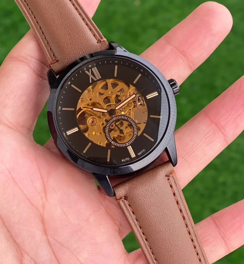 The Fossil Brown Skeleton Dial first copy men’s watch from the 7AAA Premium Collection is a striking piece that beautifully marries style with sophisticated mechanics. The standout feature is the exposed skeleton dial, giving you a glimpse into the automatic movement that powers this watch.