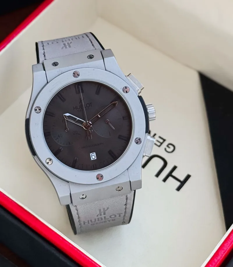 The Hublot Big Bang 7AAA first copy watch combines style and functionality with a grey dial and silver case, perfect for any occasion.