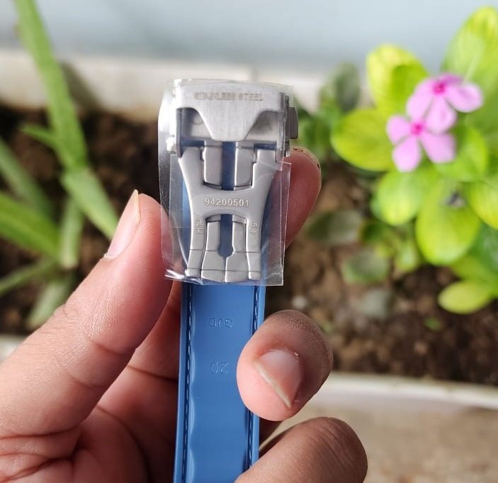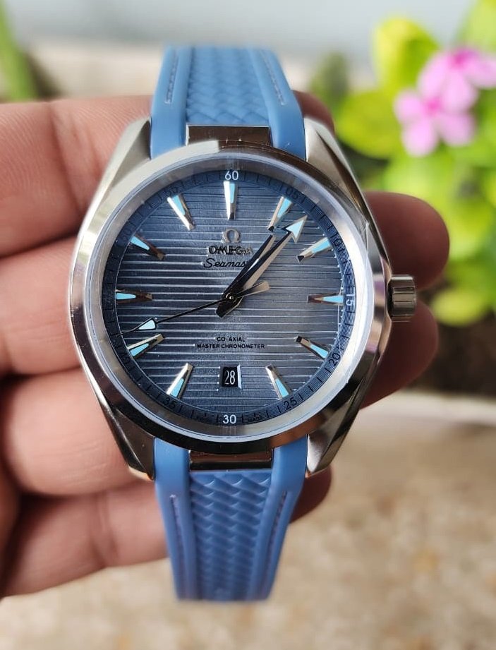 But what truly sets this watch apart is its sky blue textured silicone strap, designed for comfort and durability, featuring a secure deployment clasp that ensures it stays snug on your wrist. With the Aqua Terra, you’re not just wearing a watch; you’re making a statement.