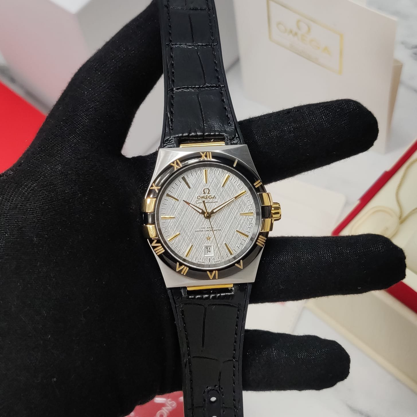 The Omega Constellation Chronometer Automatic Watch is a striking timepiece designed for the modern man who appreciates both style and precision. With its 41mm stainless steel case, this watch features a sophisticated black bezel adorned with gold accents that seamlessly complements the elegant silver dial.
