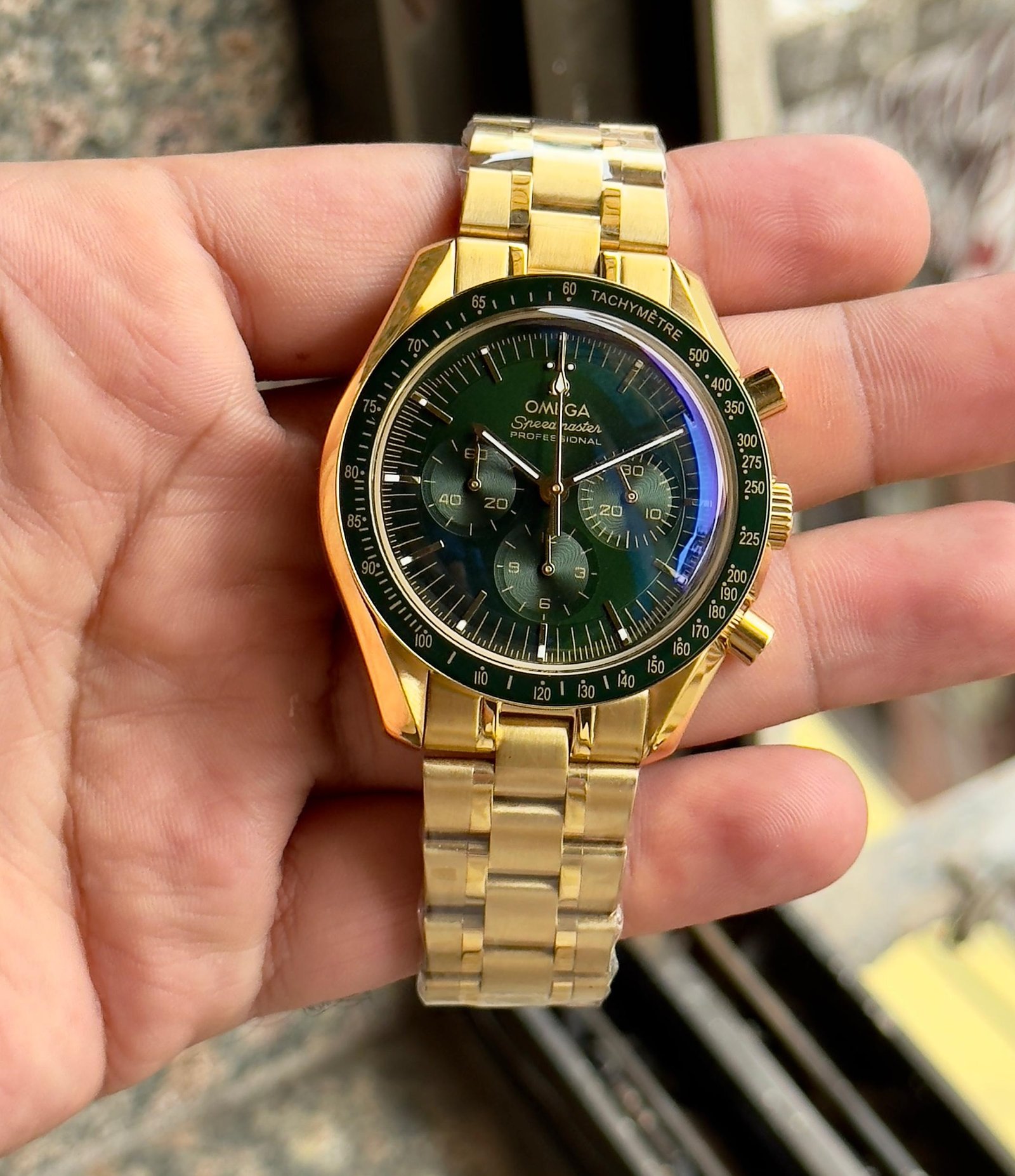 This is First Copy of Omega Moonwatch Gold Green Dial Chronograph.