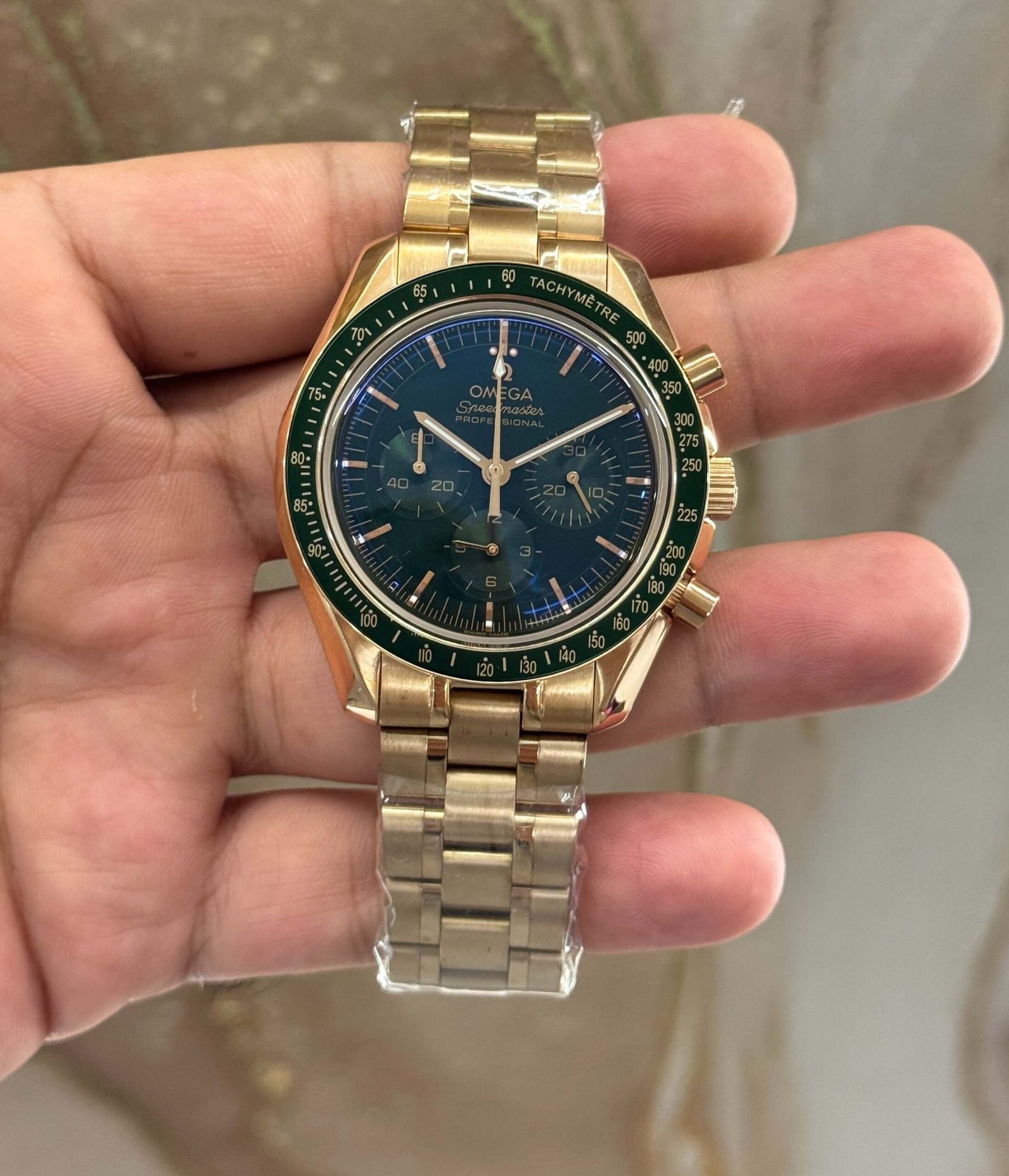 Discover the Omega Moonwatch Professional Green Dial Chronograph, a stylish blend of function and design featuring a working chronograph and RG finish.