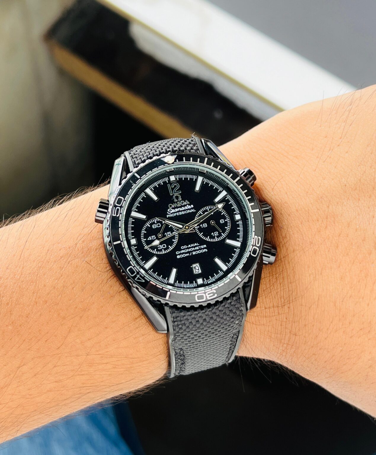 The Omega Seamaster Black Chronograph Watch is designed for those who appreciate both style and functionality. With its bold solid black stainless steel case and smart fit fiber silicon strap, this watch is the perfect blend of durability and sophistication.