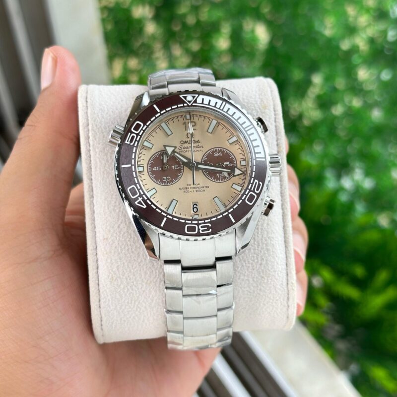 The Omega Seamaster Planet Ocean 600M Beige Dial Watch is a true testament to precision and style. With its robust 45mm stainless steel case, this watch is designed for those who appreciate both functionality and aesthetics. The stunning beige dial, accented with white hour markers, offers a unique look that sets it apart from the ordinary.